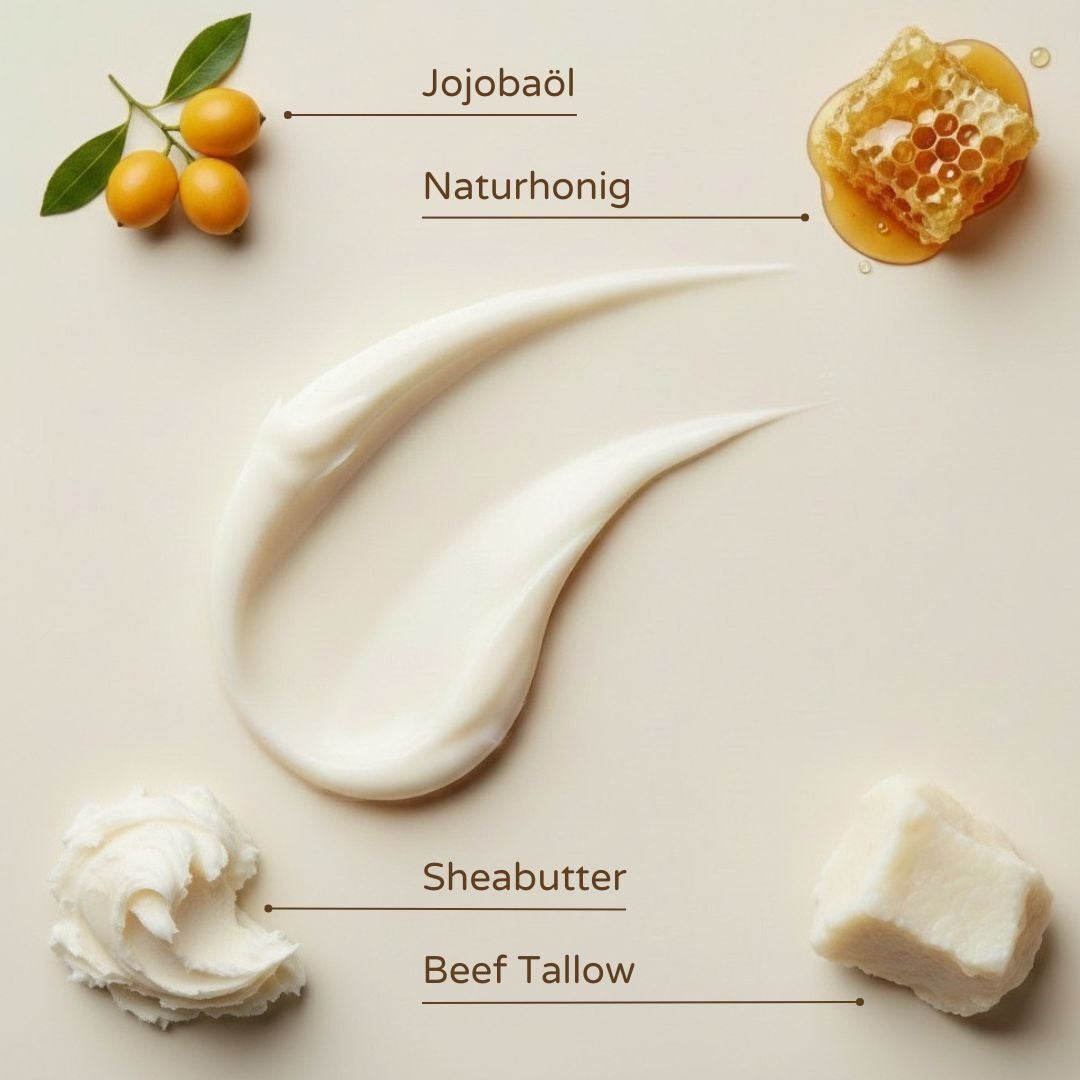 Rindertalg ist ein traditioneller, natürlicher Rohstoff, der seit Jahrhunderten in der Hautpflege verwendet wird. Schon unsere Vorfahren nutzten ihn, um trockene und beanspruchte Haut zu schützen und zu pflegen. Seine einzigartige Zusammensetzung aus Vitaminen und essenziellen Fettsäuren ähnelt den natürlichen Lipiden unserer Haut – deshalb wird er so gut aufgenommen und sorgt für spürbar glatte, geschmeidige Haut. Heute erlebt Rindertalg eine Renaissance als nachhaltiger, hochwirksamer Inhaltsstoff in moderner Naturkosmetik.